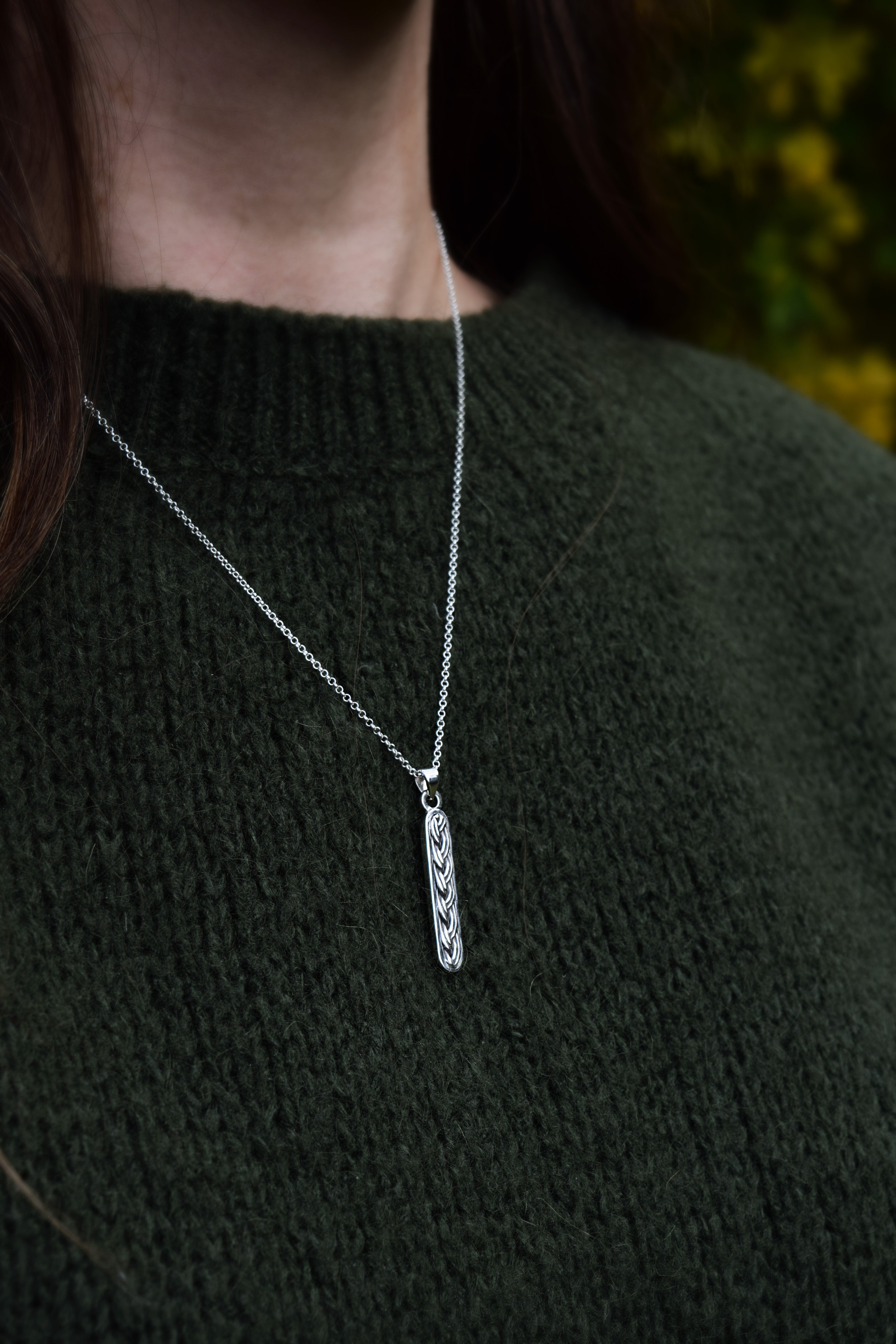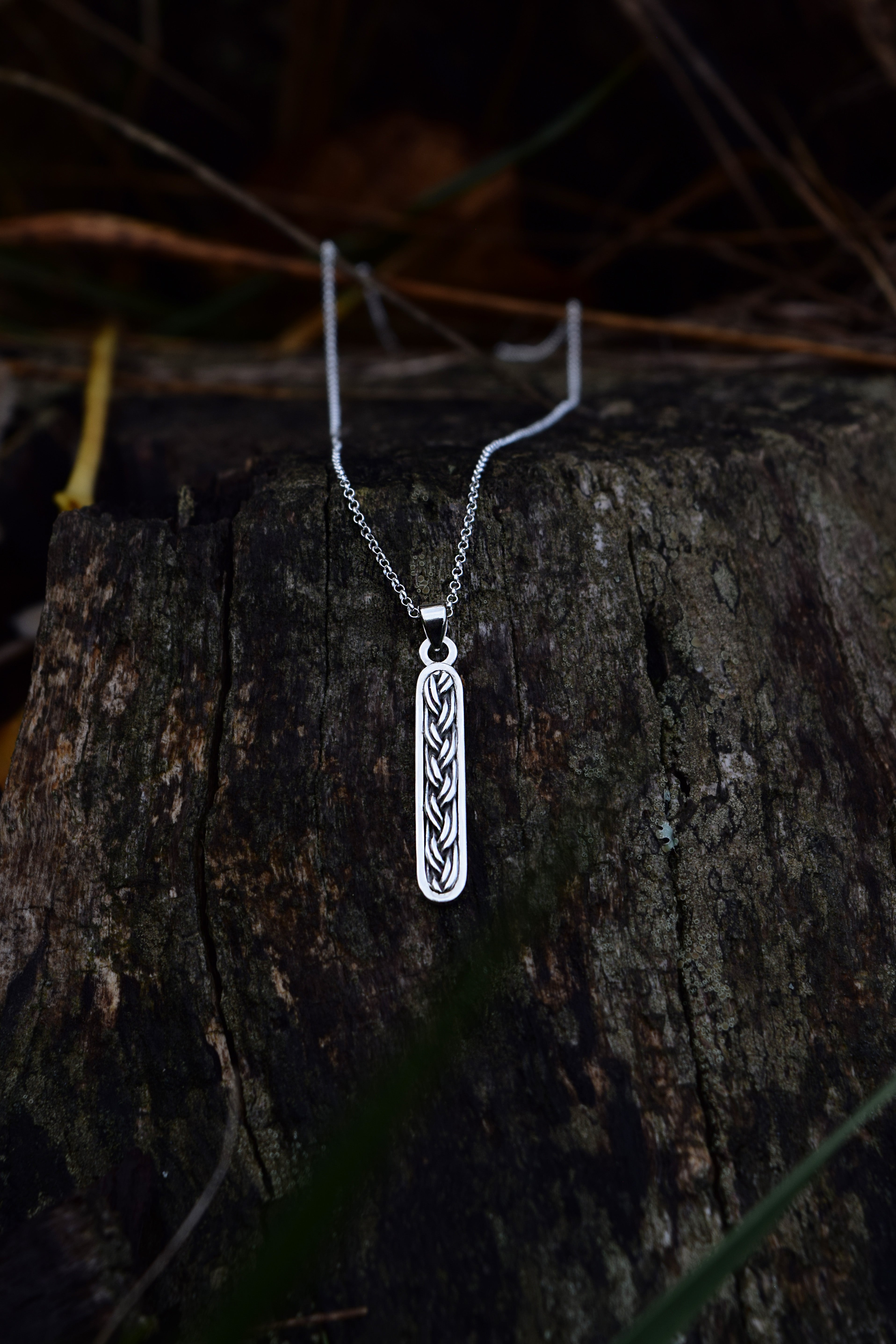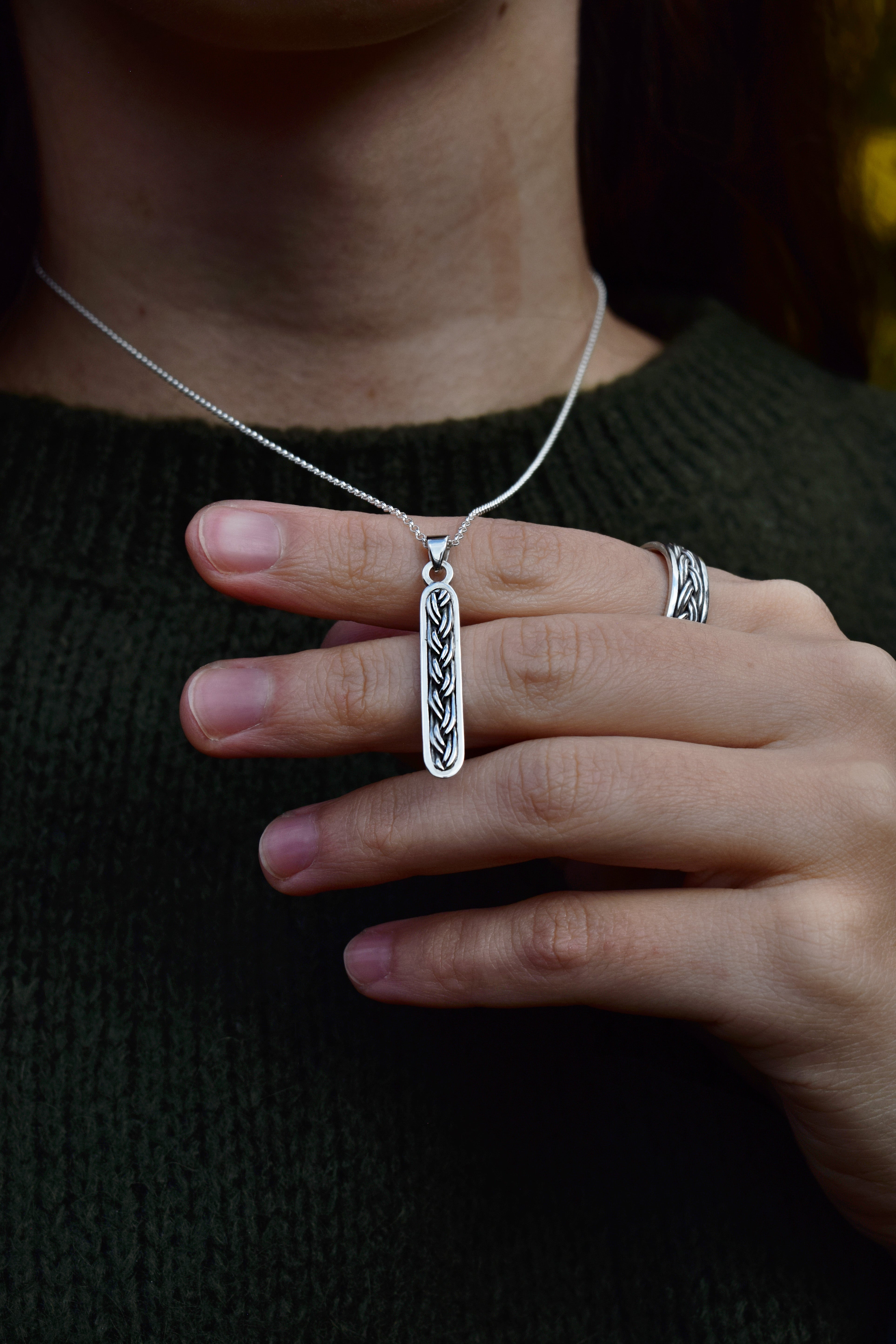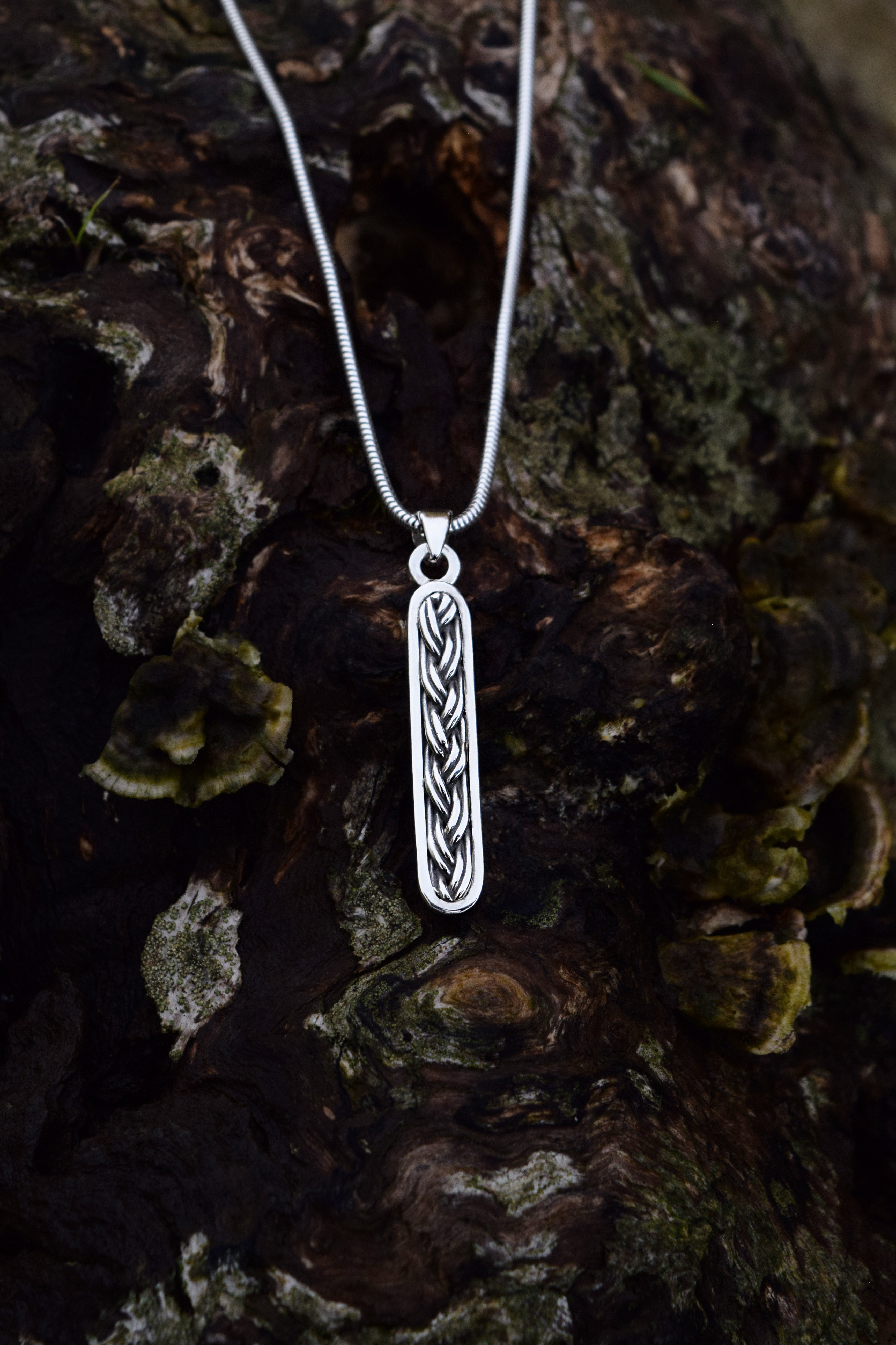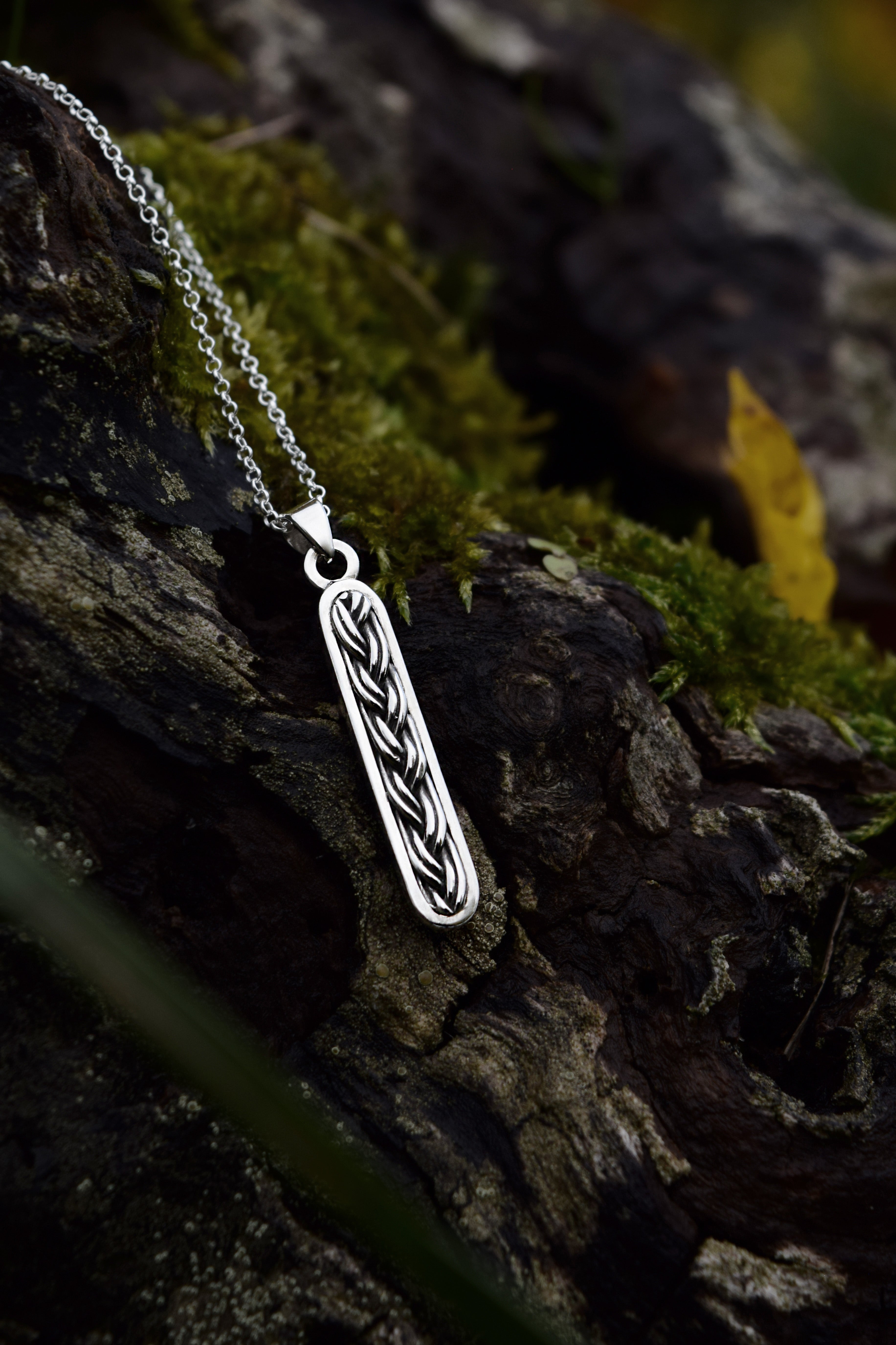 The Woven necklace draws its design from Sámi braided bracelets. Handcrafted in 950 silver, it also carries a Viking and Celtic inspired edge.